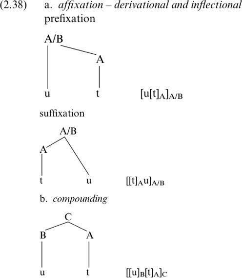 Recall that Kiparsky (1982) assumes distinct morphological structures for prefixed forms, suffixed forms and compounds, as shown in (2.34). He also holds that morphological brackets may trigger or block phonological rules. However, Mohanan and Mohanan (1984), Halle and Mohanan (1985) and Mohanan (1986) all disagree with one or both of these assumptions, arguing that compounds and derived or inflected forms are identical in terms of bracketing, or that, even if there are different bracket configurations, phonological rules may not be blocked by them.