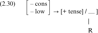 We now return to Halle and Mohanan's phonological arguments for a four-level lexicon, beginning with cyclicity. Their Stratum 1 is clearly cyclic, like the initial level in other lexical phonologies of English (Kiparsky 1982, 1985; Booij and Rubach 1987); some evidence for this is that the stress rules, which are situated on Level 1, are generally agreed to operate cyclically, and that rules like Trisyllabic Laxing/Shortening clearly obey the Strict Cyclicity Condition. Halle and Mohanan also provide evidence for the non-cyclic nature of Stratum 2. First, they argue that Stem-Final Tensing (which operates on Stratum 2 in their dialects A and B, although it is ordered on Stratum 3 for Dialect C ± see below and also Halle and Mohanan 1985: 59-62) would produce the wrong output if applied cyclically. In Dialects A and B, Tensing occurs word-finally, before inflections, stem-finally in compounds, and before Class II derivational affixes, except-ful and-ly; Halle and Mohanan's Tensing rule is given in (2.30). It should be noted that this rule affects only tenseness: Halle and Mohanan generally separate lengthening and tensing processes, and regard length as the underlying dichotomizing feature in their English vowel system, with tenseness introduced by a redundancy rule during the course of the derivation.