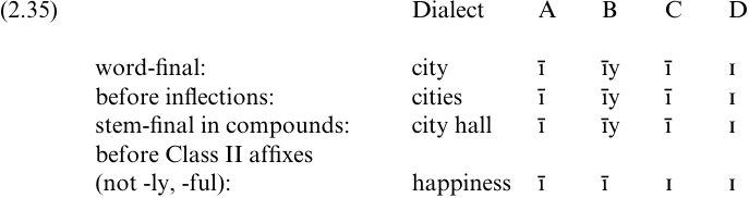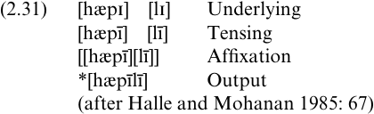In Dialect D, stem-final /I/ is never tensed or lengthened. In Dialects A and B, Stem-Final Tensing takes place in all the environments in (2.35); Halle and Mohanan order this rule on Stratum 2 for these dialects. However, /ɪ/ does not tense in Dialect C before Class II derivational suffixes, and [ã Å] in Dialect B does not lengthen, or diphthongize, in this environment. Stem-Final Tensing (Dialect C) and Stem-Final Lengthening (Dialect B) cannot apply on Level 2, since they would then produce *[hæpīnεs] and *[hæpīynεs]. Halle and Mohanan assign these rules instead to Stratum 3, where the appropriate vowel before Class II derivational suffixes will no longer be constituent-final due to Bracket Erasure.