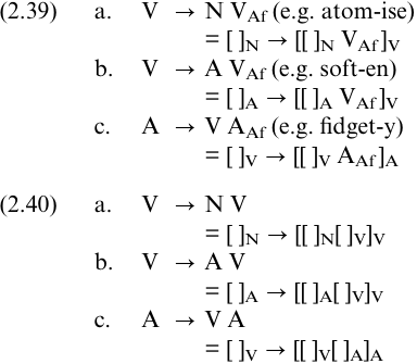 I propose that inflection and derivation should instead be represented equivalently, as b. in (2.36) above, and that the category-changing versus category-maintaining parameter should be regarded as less significant, since it is not the case that all derivational affixation entails an alteration of category; for instance, prefixation of un- to an adjective produces a (negative) adjective. The resulting tree and bracket notations, which are equivalent to those of Kiparsky (1982), are given in (2.38) below.