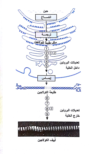 شكل (1) مراحل تخليق الكولاجين والتعديلات التي تطرأ عليه من الاستنساخ وحتى نضج اللييف
