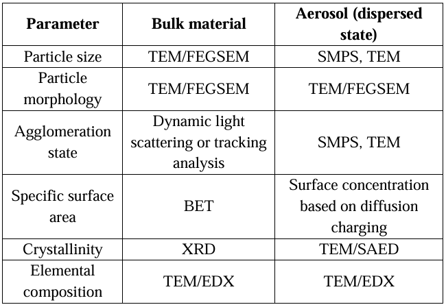 الخواص التي تتم دراستها في توصيف وتشخيص المواد النانوية nanomaterials هي الحجم، الشكل، توزيع الحجم التكتل شحنة السطح ومساحة السطح يتم تشخيص المواد النانوية في فحوصات كيميائية وفيزيائية عدة ومن ضمنها، كما مبين في جدول (2.1) و