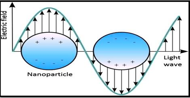 تعتمد الخصائص البصرية مثل الانعكاس، والنقل والامتصاص، وانبعاث الضوء للمواد النانوية اعتمادا كليا على بنيتها الإلكترونية التي تختلف اختلافًا كبيرًا في الأشكال المختلفة نظرا لأن البنية الإلكترونية للمواد النانوية تعتمد إلى حد كبير على ذرات السطح. هناك عاملان، وهما زيادة تباعد مستوى الطاقة التأثير) الكمي) ورنين البلازمون السطحي، يساهمان بشكل كبير في الخصائص البصرية المعتمدة على الحجم للمواد النانوية. يتم ملاحظة تأثيرات الحجم على الخصائص البصرية عندما يتم تقليل حجم الجسيمات إلى 10 نانومتر على المستوى النانوي، تكون الجسيمات النانوية صغيرة جدًا بحيث لا تكون الإلكترونات الموجودة فيها حرة الحركة كما في حالة المواد السائبة. بسبب هذا الحصر الكمي للإلكترونات، تتفاعل الجسيمات النانوية بشكل مختلف مع الضوء مقارنةً بالمادة السائبة. الأبعاد المخفضة في التركيب الإلكتروني للمواد النانوية لها التأثير الأكثر أهمية على طاقات المدار الجزيئي الأعلى المشغول، وهو نطاق التكافؤ، والمدار الجزيئي الأدنى غير المشغول، وهو في الأساس نطاق التوصيل. تحدث الخصائص البصرية مثل الانبعاث والامتصاص عندما يحدث انتقال الإلكترون بين هذين النطاقين تزداد فجوة الحزمة الضوئية مع انخفاض حجم الجسيمات خاصة بالنسبة للمواد النانوية شبه الموصلة عندما ينخفض إلكترون من حالة طاقة أعلى إلى حالة طاقة أقل، فإن كما من الضوء (فوتون) بطول موجة hc/ ΔE 4⅟ ʎسينبعث حيث، ΔE، h.C هي ثابت بلانك، وسرعة الضوء, وفرق الطاقة بين مستويات طاقة الإلكترون المسموح بها ، على التوالي كلما زاد حجم AE كلما كان الطول الموجي أقصر إزاحة اللون الأزرق وهكذا تمتص المواد النانوية شبه الموصلة وتنبعث منها الضوء عند أطوال موجية معينة تعتمد بشدة على كل من حجم وشكل الجسيمات بسبب تأثيرات الحبس الكمومي من خلال تغيير حجم وتكوين المواد النانوية، يمكن ضبط أطوال موجات انبعاثها من الأشعة فوق البنفسجية عبر المنطقة المرئية إلى مناطق الأشعة تحت الحمراء القريبة من الطيف. على سبيل المثال، من خلال ضبط حجم الجسيمات النانوية القشرة CdSe-CdS الغروية التي يتراوح قطرها من 2 إلى 6 نانومتر، يمكن إزاحة الطول الموجي للانبعاث عبر الطيف المرئي، حيث تنبعث الجسيمات الأصغر باللون الأزرق وتنبعث الجسيمات الأكبر حجمًا من الضوء الأحمر كما في (الشكل 18.1) عندما يصبح حجم الجسيم أقل من الطول الموجي للإشعاع الساقط، تصبح ظاهرة رنين البلازمون السطحية مهيمنة للتحكم في الخصائص البصرية للمواد النانوية رنين البلازمون السطحي هو نتائج الإثارة المتماسكة للإلكترونات الحرة للمواد النانوية، الموجودة في نطاق التوصيل وتذبذبات الرنين في الطور مع الطاقة الضوئية المطبقة. وبالتالي يمكن أن تنتج المواد النانوية رنينا للطعام السطحي، على عكس المواد السائبة. تتناسب شدة رنين المأكل بالسطح بشكل مباشر مع عدد هذه الإلكترونات المثارة وثابت العزل الكهربائي للوسط المستخدم يمكن للمعادن مثل الذهب والفضة والألمنيوم أن تدعم أنماط الطحين السطحي حيث يتردد صدى الإلكترونات الحرة في المادة بشكل طبيعي بتردد يعتمد على تكوين الجسيمات وحجمها وشكلها. كما هو مبين في الشكل (19.1)، تنتج جزيئات الذهب أو الفضة النانوية ألوانًا مختلفة لأحجام وأشكال مختلفة.