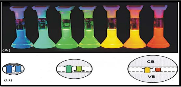 الشكل (18.1) (أ) الجسيمات النانوية ذات القشرة الأساسية CdSeCds بقطر 1.7 نانومتر (أزرق) حتى 6 نانومتر (أحمر)، مما يدل على تحجيم فجوة النطاق لأشباه الموصلات مع حجم الجسيمات. (ب) تمثيل تخطيطي لتأثير الحجم على الفجوة بين نطاق التكافؤ (VB)، وفرقة التوصيل (CB)، والامتصاص (السهم لأعلى والفلورة (السهم لأسفل). الجسيمات الأصغر لها فجوة نطاق أوسع