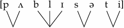 The next step is to go to the end of the word and start connecting the nucleus of each syllable with the surrounding consonants. The last syllable has no coda, and the nucleus will be attached to the preceding /t/, because [ti] is an acceptable sequence in English. After this, we move to the nucleus of the preceding (third) syllable, which is an [ə]; the lack of any coda in this syllable and the acceptability of a [sə] sequence in English tell us that this will be the third syllable of the word. There are two consonants to the left of the nucleus of the second syllable /ɪ/. Connecting /ɪ/ to the immediately preceding /l/ is no problem, as [lɪ] is a perfectly normal sequence in English. The next consonant to the left, /b/, is also going to be connected with the second syllable, because the resulting [bl] is an acceptable onset in the language (e.g. blue [blu], block [blɔk]). Thus, the resulting syllabification of this word will be:
