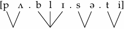 The principle on which we make the decision in these cases, which is known as the ‘maximal onset principle’, simply assigns any series of intervocalic consonants to the syllable on the right as long as it does not violate language-specific onset patterns. To demonstrate this, let us look at the word publicity again. This word, unambiguously, has four syllables and the nuclei are clearly identifiable vowels. First, we need to phonetically transcribe the word and identify the syllable nuclei.