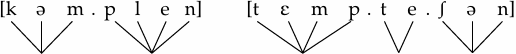 Our focus will be the [mp] sequence the two words share. As the syllabifications above make clear, the same sequence behaves differently in the two words. While in temptation [tεmp.te.ʃən] the [mp] sequence is the double coda of the first syllable, in complain [kəm.plen] the two sounds fall into separate syllables; [m] belongs to the coda of the first syllable, and [p] is part of the double onset of the second syllable. The reason for this difference is what is allowed as a maximal onset in English. Since [pt] is not a possible onset, [p] has to stay in the first syllable of temptation. In complain, however, [p] is part of the onset of the second syllable because [pl] is a permissible onset in English.