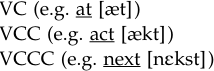 While we were talking about the syllabification of words that involve the use of two or more consonants in a row between vowels, the determination regarding which syllable they should belong to was made with reference to language-specific facts. For example, a word such as acne [ækni] will have the f irst consonant as the coda of the first syllable, and the second consonant as the onset of the second syllable. The obvious reason is that English does not allow /kn/ as an onset cluster. This will not be the case if we are talking about Norwegian (e.g. Knut), Hebrew (e.g. Knesset), Russian (e.g. kniga), or German (e.g. Knabe). It is time now to deal with the specifics of English syllable structure.