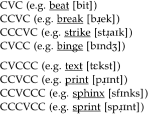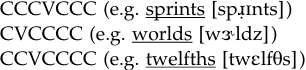 The picture given above is still a very general one and does not include the numerous restrictions we have on onsets and codas.