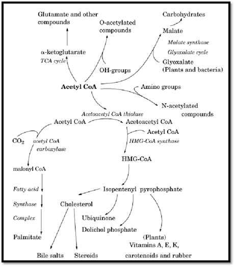 Figure 3. The central role of acetyl CoA in biosynthetic pathways.
