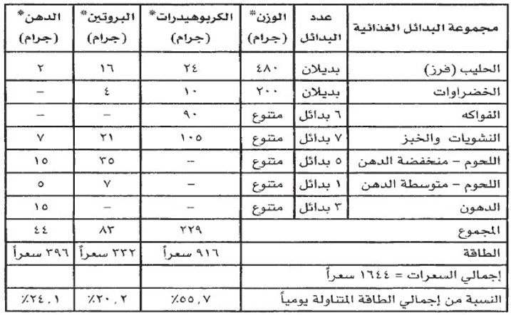 وذلك بناءً على كمية الطاقة التي يحتاجها يومياً. ويوصى عادة باختيار بدائل الحليب الخالية من الدهن وبدائل الخبز والنشويات قليلة الدهن وبدائل اللحوم منخفضة الدهن. وفيما يلي عدد البدائل الغذائية التي يحتاجها مريض السكري لتزويده بحوالي 1600 سعر يومياً، بالاسترشاد بجدول رقم التالي: