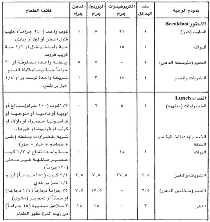 مثال لتوضيح طريقة تخطيط وجبة غذائية لمريض السكري غير المعتمد على الأنسولين: