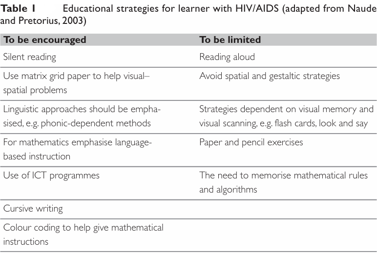 Learners with HIV/AIDS undoubtedly also have many difficulties that include psychological, neglect and social interaction problems, but it is the educational impact of this infection that is to be considered in greater detail. This is fast becoming an important issue as effective anti-retroviral drugs mean that many more children with this infection are surviving through to adulthood (Safriel et al., 2000).