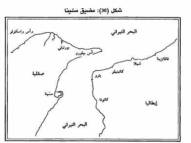 يفصل مضيق مسينا بين شبه الجزيرة الإيطالية وجزيرة صقلية وهو عبارة عن قناة طبيعية تربط بين البحر التيراني في الشمال والبحر الأيوني في الجنوب ويصل اتساع المضيق إلى حوالي (20) ميلاً أو (32) كيلومتراً بينما يتراوح أضيق نطاق به ما بين ميلين في الشمال وعشرة أميال في الجنوب ويبلغ أقصى عمق حوالي (300) قدم أو قرابة مائة مترعند المدخل الشمالي للمضيق وتمثل العوائق الطبيعية وخاصة الأمواج العالية والتيارات البحرية التي يتعرض لها المضيق أهم مساوئ استغلال هذا المضيق وذلك منذ القدم وخاصة في فصل الشتاء حيث تصل تيارات المد إلى أقصى مدى بسرعة (4) عقد إذ تمر من الجنوب إلى الشمال وتحدث كل ست ساعات فينخفض منسوب المياه ما بين (6) إلى (8) بوصة كما تساعد الرياح الشمالية السائدة على خفض سرعة التيارات السطحية البحرية المتجهة شمالاً إلى (3) عقد، بينما تزيد من سرعة التيارات المتجهة جنوباً إلى (9) عقد. وللمضيق أهمية اقتصادية كبرى خاصة بالنسبة لإيطاليا حيث يصل بين شبه الجزيرة الإيطالية، وجزيرة صقلية، ويختصر المسافة الملاحية بين الموانئ الإيطالية فبدلاً من أن تمر السفن حول جزيرة صقلية نجدها تمر عبر المضيق، كما أن المضيق لا يمثل عقبة طبيعية للاتصال بين شبه الجزيرة الإيطالية وجزيرة صقلية حيث يتمثل الاتصال السريع ومد الكوابل الكهربائية التي ساهمت في عدم وجود عزلة بشرية واقتصادية أو حضارية بين شبه جزيرة إيطاليا وجزيرة صقلية إذ يقوم السكان على جانبي المضيق بتقديم الخدمات للسفن العابرة من وقود وتموين وغيرها، كما يقومون بمزاولة حرفة الصيد البحري، وذلك لغنى المضيق بالأسماك والأصداف البحرية هذا ويمثل المضيق أهمية اقتصادية واستراتيجية للحكومة الإيطالية إذ يساعد على ربط أكبر الجزر التابعة للحكومة الإيطالية وهي جزيرة صقلية بطرق ملاحية رخيصة خاصة بشمال إيطاليا التي استطاعت أن تستغل الثروات الطبيعية المتواجدة بجزيرة صقلية وإدخالها في الصناعة، كالكبريت، والإسمنت وغيرها من المعادن الأخرى كما استطاعت الحكومة الإيطالية بسيطرتها على المضيق من مراقبة الأنشطة العسكرية في غرب وشرق البحر المتوسط.