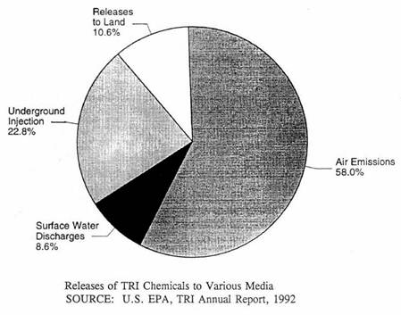 وعلى المستوى الاقتصادى يجب ألا يغيب عنا أن المدخل الخاص بمعالجة النفايات وطرق التحكم والمراقبة للمشاكل البيئية يتكلف تكاليف باهظة ومن الطبيعى أن تحمل على سعر المنتج النهائى . وقد أظهرت التقديرات الخاصة بهذه التكلفة أنها قد تصل إلى حوالى 115 بليون دولار سنويا فى الولايات المتحدة وحدها . وبالرغم من تلك التكلفة الباهظة للتحكم فى التلوث إلا أنه قدر أن حوالى 3 بليون رطل من المخلفات قد تم إطلاقها فى البيئة عام 1992 وذلك وفقا لتقارير وكالة حماية البيئة الأمريكية US Enviromenal Protection Agency والتى رصدت إطلاق حوالى 300 مركب كيميائى . ويوجد حاليا على المستوى التجارى تداول أكثر من 70000 مركب كيميائى فى الولايات المتحدة ومن الطبيعى أن تكون قدره وكالات مراقبة التلوث محدودة لمتابعة إطلاق كل هذه المركبات ولكن تركز هذه الوكالات على عدد قليل من المركبات التى تمثل الخطر الأكبر على صحة الإنسان والبيئة . ويبين الجدول والشكل ادناه الكمية والنسبة المئوية للمواد الكيميائية التى انطلقت فى البيئة عام 1992 .