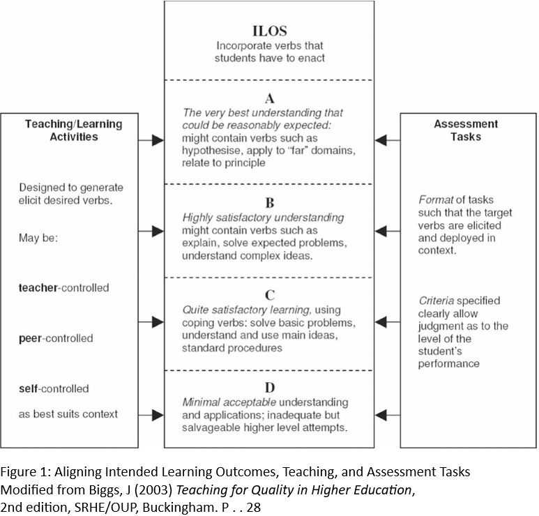 The verbs create alignment throughout the system, and because the alignment is based in constructivist psychology, I call it constructive alignment (Biggs, 1996; 2003) (Figure 1)