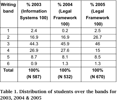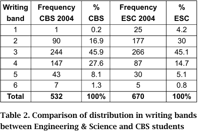 In 2003, it was decided to establish whether there was a correlation between the band and final results in the unit. A statistical analysis enabled us to establish that there was a positive relationship between writing task band and final grade; that is, the higher students were on the bandscales, the more likely they were to receive higher grades for their unit.