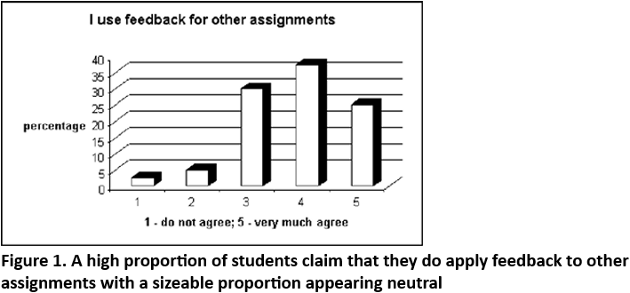 According to the students' questionnaires, the majority said that they used feedback in other assignments. A surprisingly high proportion was neutral and this may reflect either that the feedback was considered to be specific for a particular essay or that, although it was of a generic nature, they were unwilling or unable to apply it to other work.