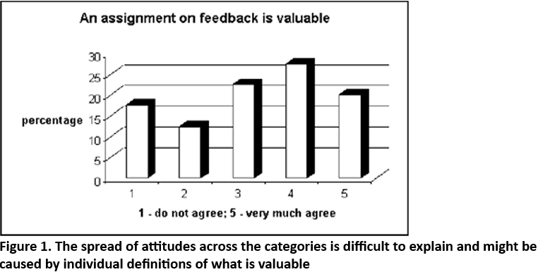 These observations are in line with a survey undertaken by Maclellan (2001) showing that most students felt that feedback was only sometimes helpful with 30% of respondents stating that feedback never helped them to understand. These data may also support Ding's (1998) observations that many students make little or no use of feedback comments even if they read them. However the spread of responses to this question also reflect Brookhart's observations that successful students use both marks and feedback to direct their future study (Brookhart, 2001).