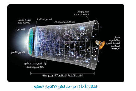 6- النظرية الحديثة : يعتقد معظم العلماء بأن الكون نشأ قبل فترة تتراوح بين 10 - 15 بليون سنة ماضية خلال ما يعرف بالانفجار العظيم (الشكل (1-1) تفترض النظرية الحديثة بأن كل مادة الكون مركزة في كتلة صغيرة جدا في حجم الذرة وهى تتميز بكثافة عالية جدا. هذه المادة هي التي كانت سببا في ولادة كل شيء، أطلق عليها اسم (بذرة البداية) حدث انفجار لسبب ما لهذه البذرة، نتيجة الكميات الهائلة من الطاقة الكامنة بداخلها وقذفت بمادتها في الفضاء، في جميع الاتجاهات، ثم بدأ الكون بعد الانفجار في الاتساع، وبدأت المواد الكيميائية والغازات الساخنة والسحب المضطربة في التكون تعرضت جميع الأجسام المنتشرة بالفضاء للبرودة بعد فترة من الزمن، ومن ثم نتجت المجرات والنجوم. وتقترض هذه النظرية أن الكون سيستمر في الاتساع إلى مالا نهاية، وتنص هذه النظرية أيضا أن الكون كان طاقة خالصة، خلال الثانية الأولى بعد الانفجار العظيم وأن هناك قوى رئيسية أربعة انفصلت بعد الانفجار وهما الجاذبية، القوة الكهرومغناطيسية، القوة النووية الشديدة، والقوة النووية الضعيفة، انفصلت جميعها وعانى الكون توسعا هائلا ، فالمادة وعكسها تصادمت ومحت إحداهما الأخرى وبقي جزء ضئيل من المادة التي شكلت الكون، وباستمرار توسع الكون وبانخفاض حرارته تكونت النجوم والمجرات وتغير التركيب الكيميائي للكون، فقد كان في بدايته مكوناً من 100 % من الهيدروجين والهيليوم بينما الآن 98 % منه يتكون من الهيدروجين والهيليوم.