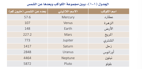 ــ كوكب عطارد Mercury يعتبر عطارد أصغر الكواكب السيارة وأقربها إلى الشمس حيث يبلغ متوسط بعده عن الشمس 58 مليون كيلو متراً. قطر عطارد يساوي 1/3 قطر الأرض، وتصل درجة حرارة نصف كوكب عطارد المقابل للشمس إلى 400 درجة مئوية، بينما تهبط حرارة الجانب المظلم إلى 250 درجة مئوية تحت الصفر. يدور عطارد حول الشمس دورة كاملة كل 88 يوما فقط من أيامنا الأرضية، ولكنه يبطئ جداً في دورانه حول نفسه إلى درجة أن دورته حول نفسه تساوي السنة فيه، أي أن يومه = سنة. كتلة كوكب عطارد = 1/18 من كتلة الأرض. وتبلغ جاذبيته حوالي 3/8 من الجاذبية على سطح الأرض. ولا تدور أية أقمار حول كوكب عطارد مثله في ذلك مثل كوكب الزهرة.