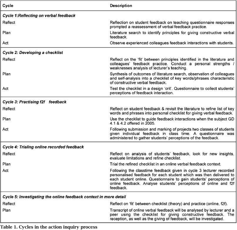 Data contributing to the action inquiry into formal oral feedback in the graphic design 'crit' has been gathered over five cycles of reflect-plan-act (Table 1).