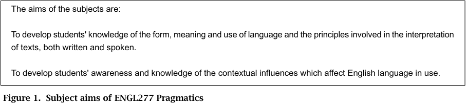 Bearing in mind the issues and guiding principles discussed above, the syllabuses of the subjects Pragmatics and Intercultural Communication were written to incorporate OCLA in their aims, learning outcomes and assessment. Figure 1 shows the subject aims of ENGL277 Pragmatics.