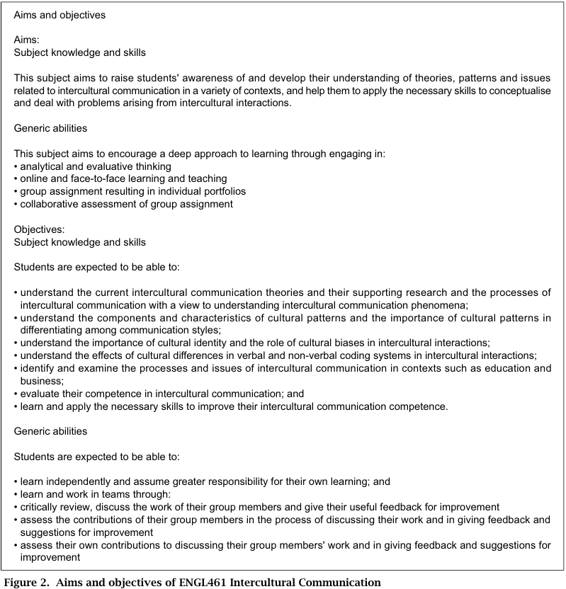 Figure 2 shows the more detailed subject aims and objectives in the syllabus of ENGL461 Intercultural Communication, which shows that both acquisition of subject knowledge and development of generic attributes are emphasized.