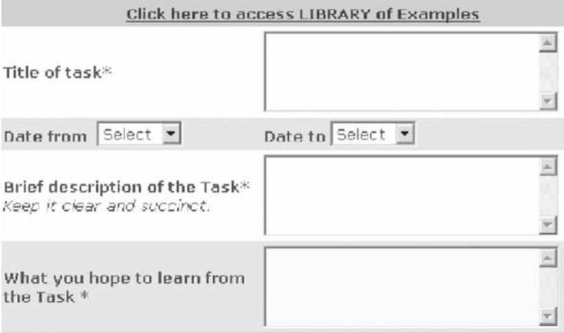 The first main section of the task web-form allows the student to describe the intended task in terms of: a title, period when the task would be performed, a brief description of the task for the layman, and the intended learning outcomes. Context sensitive help and examples available through hyperlinks guide the student through this process.
