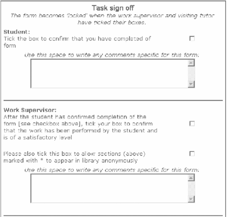 There is much discussion concerning the integration of key skills within HE programs (Fallow & Steven, 2000). Making students aware of the transferable skills they use on placement is important as previously these were neither recognized nor valued. This section on the task description web-form provides an extensive table of transferable skills. Only two skills are shown in the screenshot below but the full list includes: