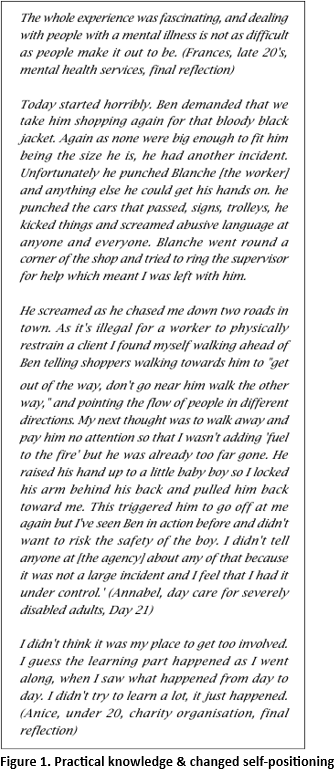 Despite all of the above-mentioned variations in experiences, there were three types of learning evident across most of them. These were the acquisition of practical knowledge; changes in self-positioning as a result of acquiring that knowledge; and, contrary to the markers' comments that there was no reflection evident in the diaries, reflection on that change.