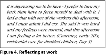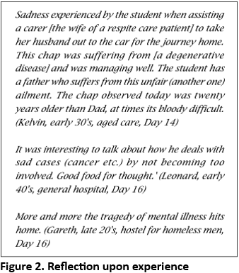 The reflection evident in the diaries was not consistent with marker expectations that students would be able to link theory with practice (the definition of reflection implicit in the assessment rubric). Reflection was directly derived from experiences, rather than a process of starting with the readings and seeing how concepts such as class might apply to the client group. Often, however, it was not possible to ascertain exactly what a student had concluded as a result of his or her reflection, even though the process of reflection was evident (Figure 1). The first extract in Figure 2, from a diary largely written in the third person (an ongoing reminder that this was an assessment task and the student's future was at stake), shows how the experiences in the placement might reverberate in another of the students' worlds: