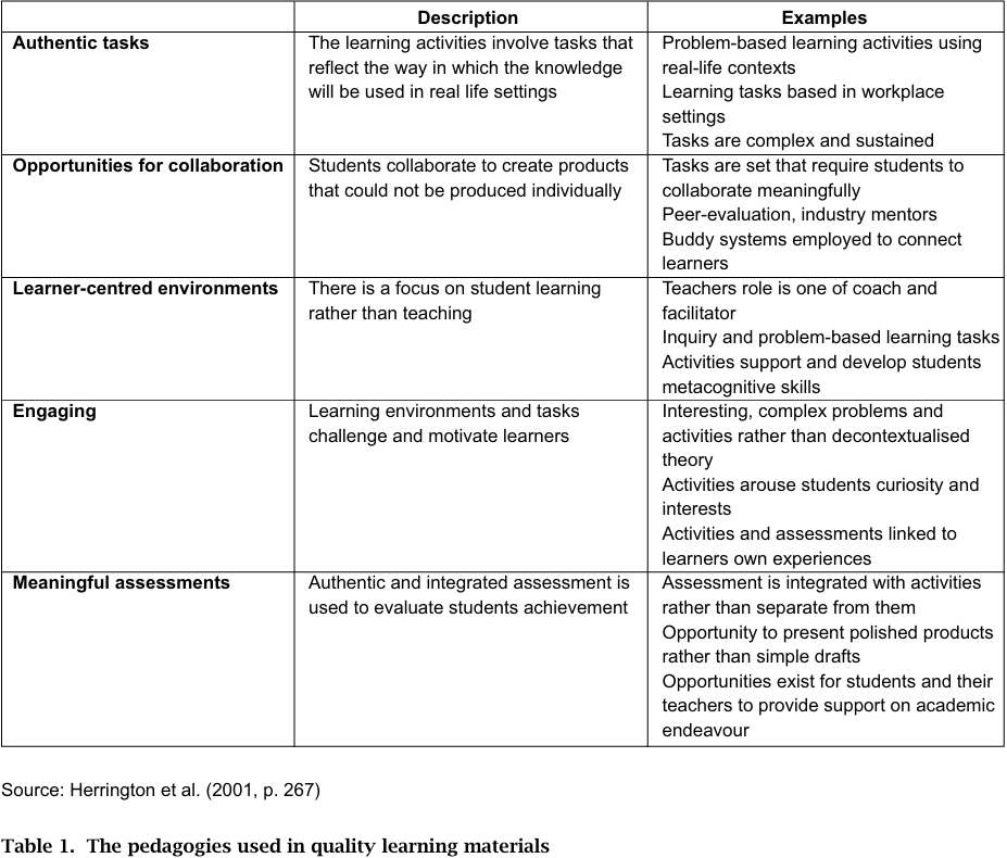 There is a growing movement towards designing electronic learning environments that recognize the communicative powers of the Internet to support an active and constructive role for learners (Oliver & Omari, 1999; Salmon, 2000; Trinidad & Albon, 2002). This module is used to model such modern ways of learning, teaching and assessment. There are many factors that influence the learning experience such as the infrastructure, the quality of content and assessment, the quality of learner support systems, the assumptions made by learners and educators about the learning experience itself, the educational design and peer support networks for learners and educators (Aldridge et al., 2003; Macnish et al., 2003; Trinidad et al. , 2001). Considering the complexity of these factors can have on the learning experience the module content and assessment tasks are carefully structured to assist the students to learn in a supported and effective learning environment where the assessment tasks drive the learning and the technology supports the learning process (Albon & Trinidad, 2002; Trinidad & Albon, 2002). The module consisted of authentic activities, materials and assessment tasks that involve real life challenges through engaging and collaborative efforts as shown in Table 1. Herrington et al. (2001) guidelines for pedagogies used in producing quality learning, teaching and assessment materials for the 12 sessions are used with the students.