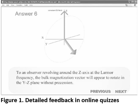 Providing elaborated feedback on quizzes is one of the more prevalent ways of creating interaction-enriched assessment where students interact with online content. A teacher of chemistry technology prepared online tutorials with a rich collection of pictures and animations to better illustrate the movement of electrons under the influence of strong magnetic fields when teaching about magnetic resonance imaging (MRI).