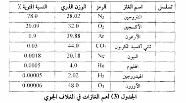 يتركب الغلاف الجوي من خليط من الغازات قيم بعضها ثابتة، وقيم بعضها الآخر متغيرة من فترة لأخرى أو مكان لآخر، ومن هذه الغازات النتروجين والأكسجين والأرغون وثاني وأول أكسيد الكربون والماء بمجالاته الثلاث السائلة والغازية والصلبة، والنيون والميتان والأوزون وعدد كبير من الغازات والجزيئات الأخرى، والجدول (3) يوضح بعض هذه الغازات ونسبتها في الغلاف الجوي. ويتبين من الجدول أن أربعة فقط من الغازات الموجودة في الغلاف الجوي تشكل ما نسبته 99 % من حجم الهواء الجوي، بينما جميع الغازات الأخرى تشكل أقل من 1 % منه، وتسمى أحيانا بالغازات النادرة أو النزرة، وجميع الغازات مهما كانت نسبتها كبيرة أو صغيرة ذات أهمية بالغة في الغلاف الجوي، ووجودها يساعد في حفظ التوازن والاستقرار البيئي، وقد تؤدي التغيرات المصطنعة التي تتعرض لها إلى اختلال هذا التوازن وحدوث مخاطر بيئية معينة.