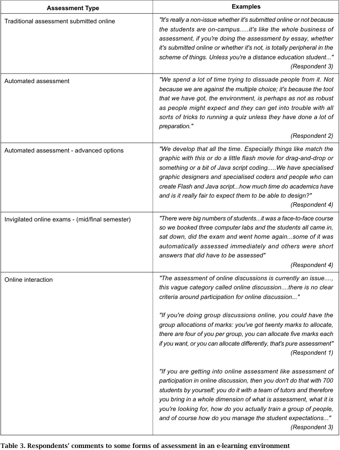 Different institutional cultures and practices in e-assessment emerge in the extracts as the respondents comment on the categories in Table 3. If an institution is primarily a traditional university, with established lectures, tutorials and laboratory sessions, then the online environment will be conceptualized in a very different way than it would be for a specialist distance education provider as suggested in the comments of respondent 3. If the learning management system is not completely tested under robust quiz conditions, as indicated by respondent 2, then the advice to academics to prepare well beforehand, is designed to ensure that student assessment occurs in a secure online environment. In this sense educational developers become an advocate for learners and for the quality of the student experience.