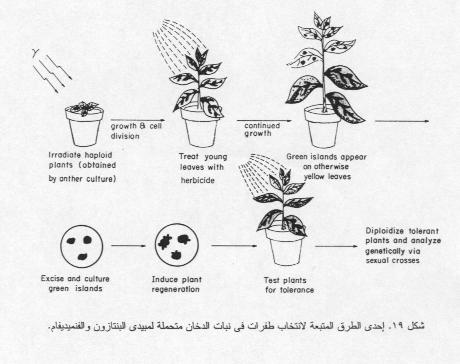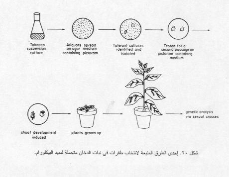 وقد عزلت تلك الأجزاء ووضعت في بيئة إنماء خاصة معروفة بقدرتها على حَثّ نمو الساق. وقد ظهرت نباتات من معظم الأجزاء المنماة، تبين أن رُبعها تقريباً مقاوم لأثر المبيد الضار. كما أمكن أيضاً إنتاج طفرات نبات دخان متحملة لمبيد البيكلورام picloram عن طريق تجهيز مُعَلّق من نبات الدخان ونشره تنقيطاً على بيئة آجار تحتوى على المبيد ، ثم تعريف الكالوس المتحمل للمبيد وعزله واختباره مرة أخرى على بيئة من المبيد، تلى ذلك حَثّ نمو الساق وترك النباتات لتنمو، ثم إجراء تحليل للجينات عن طريق التهجينات الجنسية.