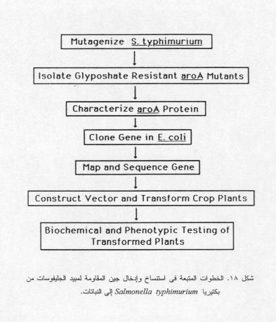 فبالاعتماد على أن موضع التأثير التثبيطى لمبيد الحشائش الجليفوسات glyphosate واحد في كل من النبات والبكتيريا، وهى إنزيمات تعرف بالإنول بيروفيل شيكمات فوسفات، أمكن من سلالات بكتيريا السالمونيللا المنتجة بالإطفار الحصول على الجين المسئول عن وجود إنزيم من تلك الإنزيمات ضعيف الحساسية والتأثر بالمبيد المذكور. وقد أمكن إدخال هذا الجين إلى DNA بكتيريا الأجروباكتريوم Agrobacterium كناقل، ثم أدخل الـ DNA بدوره إلى نباتات الدخان. وقد عبر الجين المنقول عن نفسه بالفعل في صورة تحمل تلك النباتات لتأثير ذلك المبيد.