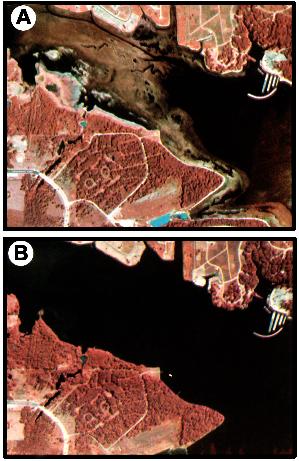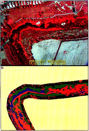 تبين أيضاً من الدراسات فعالية وكفاءة التصوير الجوي بالأشعة تحت الحمراء مصاحباً بالملاحظات الأرضية البسيطة في التقدير الحقلي وتوثيق التغيرات في مجتمعات الحشائش المائية (شكل 12 أ).