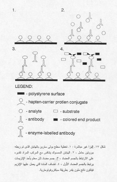 وقد ظهرت حديثاً طرقاً أكثر تطوراً، منها ما يعرف بالإليزا (enzyme linkage immunosorbent assay “ELISA”)، وهى طرق تعتمد على القواعد المعروفة لعلم المناعة في الحيوان. وترتكز فكرة هذه الطريقة على القاعدة الأساسية أن الأجسام المضادة التي يعدها الحيوان تستطيع أن تتعرف وتلتصق بدرجة تخصص منقطعة النظير على تركيبات كيميائية معينة موجودة على سطح جزيئات بسيطة أو معقدة. وفى بعض الحالات، فإن درجة تخصص هذا الالتحام يمكن أن يكون عظيماً لدرجة أن الأجسام المضادة المتخصصة لمركب البارانيتروفينول مثلاً لا تستطيع الالتحام بمركب الأرثونيتروفينول، على رغم أن التركيب الكيميائي الإجمالي لكلا المركبين واحد لا تباين فيه، ولا يقع الاختلاف بينهما إلا في وضع مجموعة كيميائية بالنسبة إلى باقي مكونات المركبين.