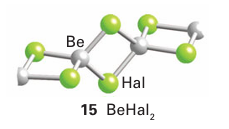 The Be atom in beryllium dihalides acts as a Lewis acid by forming a polymeric chain structure in the solid state (15). In this structure, a Ϭ bond is formed when a lone pair of electrons of a halide ion, acting as a Lewis base, is donated into an empty sp3 hybrid orbital on the Be atom. The Lewis acidity of beryllium chloride is also demonstrated by the forma tion of adducts such as BeCl4-2 (16).