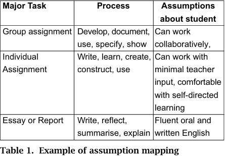 The assessment tasks were examined by the project officer to ascertain what assumptions seemed to be applied to students in terms of expectations of their intrinsic ability to undertake a task. These assumptions were then put into the database as part of the mapping object (see Table 1).