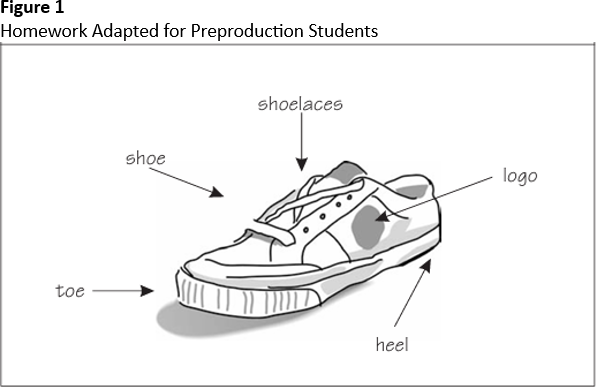 Students can practice words for items they studied during class by finding or drawing another example from home. For example, when the class talks about Nike shoes, students learn the words “toe,” “heel,” “shoelaces,” and “swoosh.” For homework, they can draw a shoe and label the parts (see Figure 1). They can also be assigned to draw and label five items from home that have been discussed in class.
