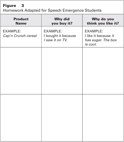 Early Production Students can also use practice with vocabulary. In addition to nouns, they should be working on vocabulary for sight, touch, sound, taste, and smell. For homework, they can select four items from home and practice writing their new vocabulary in the chart provided (see Figure 2).