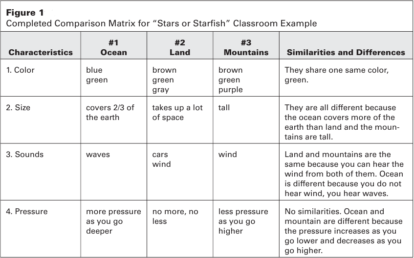 Identifying similarities and differences allows ELLs rich opportunities to develop their second language. Teacher-directed activities are important as students become familiar with the tasks of comparing, classifying, creating metaphors, and creating analogies. Allow for plenty of talk time as students demonstrate verbal abilities before moving them into written forms of distinguishing similarities and differences.