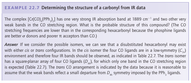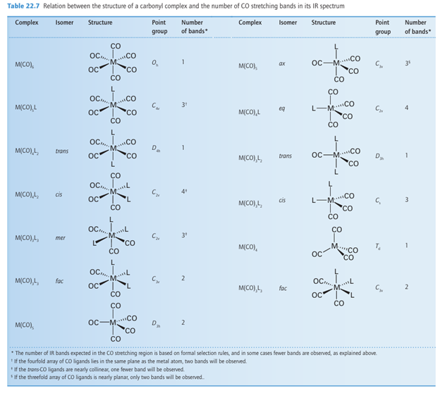 Key points: The CO stretching frequency is decreased when it serves as a π acceptor; donor ligands cause the CO stretching frequency to decrease as they supply electrons to the metal; 13C-NMR is of less use as many carbonyl compounds are fluxional on the NMR timescale.