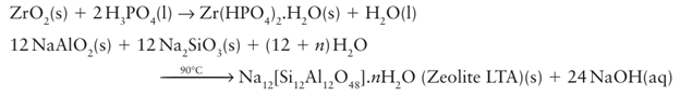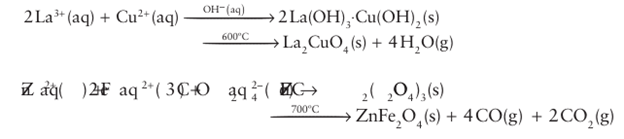 Solution methods are extended by using hydrothermal techniques, in which the reacting solution is heated above its normal boiling point in a sealed vessel. Such reactions are important for the synthesis of open-structure aluminosilicates (zeolites), analogous porous structures based on linked oxo-polyhedra (Section 24.13a), and related metal-organic frameworks (MOF) in which metal ions are linked by coordinating organic species, such as carboxylates (Section 24.13b). These porous structures are often thermodynamically metastable with respect as conversion to denser structure types so they cannot be made by direct high-temperature reactions. For example, the sodium aluminosilicate zeolite Na12 [Si12Al12 O48]. nH2O formed in solution converts on heating above 800°C to the dense aluminosilicate NaSiAlO4. More recently, other solvents such as liquid ammonia, super critical CO2, and organic amines have been used in so-called solvothermal reactions. A reaction in solution can also be used as an initial stage in the synthesis of many materials, particularly oxides, normally obtained through direct high-temperature reaction. The advantages of starting with solutions is that the reactants are mixed at the atomic level, so overcoming the problems associated with the direct reaction of two or more solid phases consisting of micrometre-sized particles. In the simplest reaction of this type, a solution of metal ions (for example, solutions of metal nitrates) is converted to a solid through a variety of methods such as evaporation of the solvent, precipitation as a simple mixed metal salt, or formation of a gel. This solid is then heated to produce the target material. Two examples are