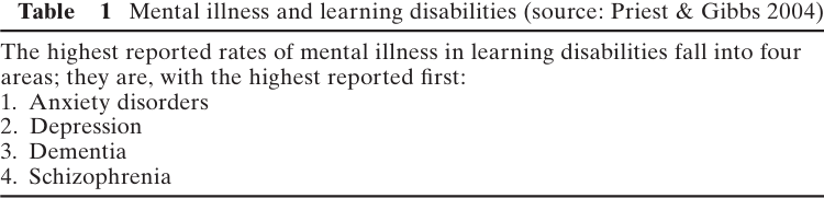 It is now generally agreed that people with learning disabilities can and do experience mental health problems and, indeed, prevalence rates are generally regarded as higher than in the general population. Priest and Gibbs (2004) suggest that their intellectual disability and the cause of this disability, such as prenatal brain damage, make people with learning disabilities susceptible to developing mental health problems. There have been findings of higher prevalence of mental health problems throughout learning disabled populations, i.e. within all levels of cognitive ability and age. Birch et al. (1970) found that 40 per cent of people with learning disabilities suffered from mental illness, compared with 10 per cent of the general population. Stromme and Diseth (2000) found that 33 per cent of people with mild learning disabilities and 42 per cent of those with severe learning disabilities suffered from mental illness. Table 1 outlines the reported rates of mental illness in learning disabilities.