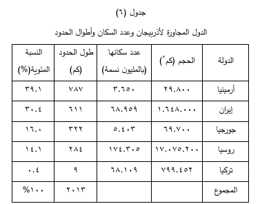 ويقصد به موقع دولة ما مع دول الجوار وعدد الدول التي تجاورها وتشاركها الحدود السياسية ، وتحد أذربيجان خمس دول ، وهي روسيا من الشمال وايران من الجنوب وجورجيا من الشمال الغربي وأرمينيا من الغرب ، وتركيا من الجنوب الغربي، وهي بهذا تجاوز دولتين إسلامية ايران وتركيا وثلاث دول غير إسلامية (روسيا، جورجيا ، أرمينيا) ، أما من الشرق فهي تطل على بحر قزوين ، أما حدودها مع أرمينيا (موضوع التطبيق) فهي تحدها بطول (787) كم، وهو أطول خط حدود مع دول الجوار ، وقد برزت عدة مشكلات بينها وبين أرمينيا كانت ابرزها مشكلة إقليم (كارباخ) ، وفي فلسلفة الجغرافية السياسية كلما زاد عدد دول الجوار وأطوال حدودها ظهرت هناك مشكلات اكثر بين هذه الدول لا سيما اذا كانت الدولة محاطة بدول مختلفة عنها بالنواحي الإيديولوجية ، كما يشكل ذلك ضعفاً جيوبوليتكياً.