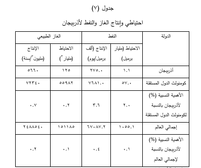 توجد في أذربيجان موارد معدنية متنوعة يأتي النفط في مقدمتها والذي يعد من الموارد الاستراتيجية المهمة ، وكان له الأثر الفاعل في مجرى العلاقات الدولية ونظراً لكثرة النفط الذي شاهده المسعودي على سواحل باكو المطلة على قزوين ، فقد اطلق عليه تسمية (ساحل) النفاطة) وقد استخدم النفط بكثرة في القرن التاسع عشر وبلغ إنتاجه في باكو سنة 1901 ما يقارب (10.7700000) برميل سنوياً وكان ذلك يعادل (74.5%) من الإنتاج العالمي ، ثم واصل الارتفاع إلى (2600600000) برميل سنوياً عام 1900 ، لكن هذا الإنتاج انخفض إلى النصف عام 1990 ، ويشكل الدعامة الاقتصادية لأذربيجان ، أما الغاز الطبيعي فقد تم اكتشافه بعد الحرب العالمية الثانية ، واصبح الاتحاد السوفيتي (السابق) اكبر منتج للنفط والغاز في العالم ودخل الغاز الطبيعي ميادين الصناعة في مجالات شتى.